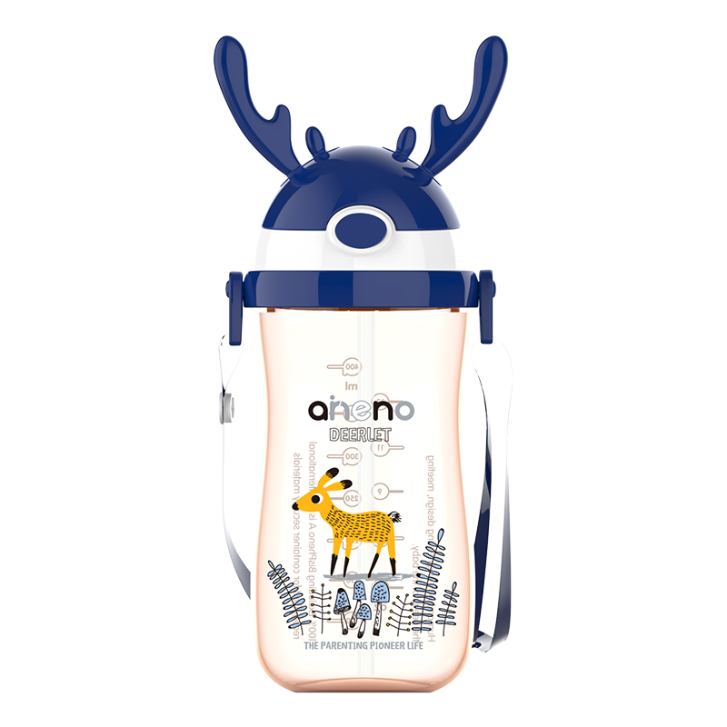 ①进口PPSU,轻便耐摔,热变形温度207℃,BPA 0% ②萌趣硅胶鹿角,无毒可做牙胶 ③气孔和“V”型管设计,三层防喷,单向导气不胀气 ④宝宝根据咬合力控制喝水流量,开盖倒置不漏水 ⑤一键开盖轻松吸管喝水 ⑥不锈钢重力球,任何姿势都能喝水 ⑦可拆卸肩带,自由出行